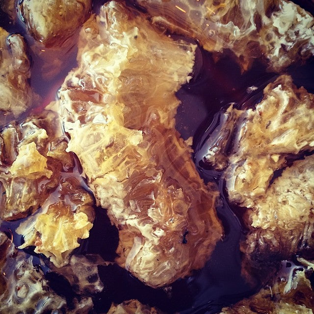 Raw honey is not filtered or heated. Real raw honey contains all the live enzymes, pollen, propolis and floral essences that the honeybees put into it. The bees determine the color, flavor, and texture of our honey by the varieties of flowers and herbs they forage.